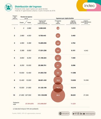 Esa brecha entre se amplió 3 puntos respecto del cuarto trimestre de 2017, según el promedio de ingresos per cápita del decil 10 (de $36.261), sobre el 1 ($1.815), que publicó el Indec.