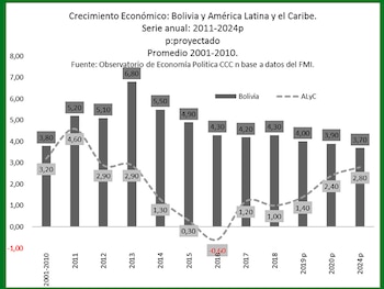 Entre 2001-2010 el promedio de crecimiento de Bolivia fue del 3,1% mientras que entre 2011-2018 creció a un promedio del 5,04%. Esto se vio reflejado en el PBI per cápita, en 2005 fue de menos de USD 1.800 para el año 2017 alcanzó los casi USD 2.500, lo que significa una mayor riqueza entre los habitantes de la economía andina-amazónica.