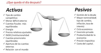 Sergio Galván, economista jefe de Santander Río, fue quien presentó esta balanza del "día después" para describir la herencia que deja el gobierno. "A pesar de los problemas que todos conocemos, el punto de partida para el próximo gobierno será mejor que el del 2015. Pero el margen para seguir mejorando es muy finito y cualquier paso en falso que se dé posteriormente podría profundizar la crisis", explicó. Fue durante el XVIII Encuentro Santander-América Latina que se está realizando en Madrid.