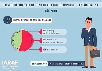 Para un ingreso mensual de bolsillo de $33.250, la carga tributaria para 2019 equivale a destinar 29 minutos y 31 segundos de cada hora trabajada al pago de impuestos y tasas. O casi cuatro horas diarias de una jornada de 8 horas. O 180 días del año, de acuerdo al informe de IARAF.