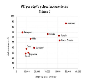 En el gráfico pueden observarse datos correspondientes al coeficiente de apertura de los países del Mercosur, además de Chile, China, Nueva Zelanda, Alemania, Francia, y España en 2018. Del mismo se puede advertir que aquellos que exhiben un coeficiente mayor, es decir, son más abiertos al intercambio con el exterior, muestran un ingreso per cápita más elevado.