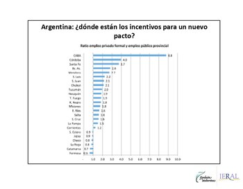 Por eso es importante la responsabilidad de la política que en sus discursos ponga en contexto las cosas que está pasando. Sino se hace, será muy difícil resolver los problemas recurrentes que se le presentan a la Argentina, como el de la situación fiscal. En el fondo tiene que ver con una base de la economía muy chica para todo el aparato estatal que tenemos arriba. Fíjese el gráfico sobre la cantidad de empleados en el sector privado registrado por cada uno en el empleo público provincial: