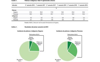 “En el primer semestre de 2019 el porcentaje de hogares por debajo de la línea de pobreza es del 25,4%; dentro de este conjunto se distingue un 5,5% de hogares indigentes. Los indicadores mencionados registran una suba de la pobreza y la indigencia con respecto al segundo semestre de 2018 y también respecto de los consignados en el primer semestre de 2018”, detalló el Indec según datos de la Encuesta Permanente de Hogares.