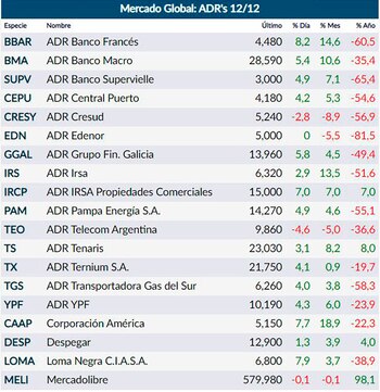 En Wall Street, los ADR’s argentinos -certificados de tenencias de acciones que cotizan en dólares- tuvieron una excelente rueda. BBVA (+8,21%) encabezó el ranking de alzas seguido por Corporación América (+7,97%), Loma Negra (+7,94%) e IRSA Propiedades Comerciales (+6,99%).