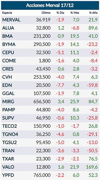 Por supuesto, las empresas de energía encabezaron el ranking de perdedores. Central Puerto (-5,60%), Edenor (-4,51%), Corporación América (-3,77%) y Transportadora Gas del Sur (-3,35%), fueron las grandes perdedoras.