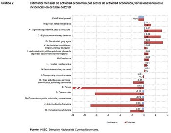 El Estimador Mensual de Actividad Económica (EMAE) de octubre mostró una caída de 0.9% interanual –comparado contra el mismo mes de 2018–, encadenando nuevamente un trimestre de caída. La buena noticia es que la performance de algunos sectores empujados por la devaluación, como el agro y el petróleo, lograron recortar la baja y, respecto de septiembre de este año, logró un incremento de 1,9 por ciento. Como contrapartida, la recesión lleva catorce meses consecutivos.