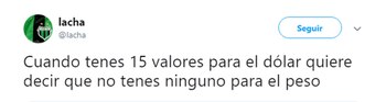En el mismo sentido se manifestó el economista Gustavo Lazzari, quien en su cuenta de Twitter sentenció que “cuando tenés 15 valores para el dólar quiere decir que no tenés ninguno para el peso". En resumen: el aumento de la cotización de la moneda norteamericana representa, en verdad, la constante erosión del valor de la moneda argentina.