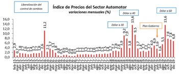 Aunque estén regidos por la cotización de la divisa, los precios de los autos subieron más que el dólar el año pasado. De acuerdo con el Indice de Precios del Sector Automotor (IPSA) que dio a conocer la Asociación de Concesionarios de la Argentina (Acara), los vehículos subieron 6,8% en diciembre -con un tipo de cambio que se mantuvo estable y una inflación del 3,7%- y escalaron 83,6% en todo el año, frente a un dólar que subió 60% y un Indice de Precios al Consumidor (IPC) que trepó 53,8%.