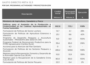 El gasto directo vinculado al Objetivo de Desarrollo Sostenible (ODS 12) ascendía a noviembre de 2019 a $790 millones y el gasto devengado resultó 9% superior al de 2018, fundamentalmente destinado al Programa de Políticas para el Aumento de la Producción Productividad de las Cadenas Agroindustriales (Ministerio de Agricultura, Ganadería y Pesca). El gasto indirecto, de $7.167 millones, estuvo prioritariamente asociado a actividades de investigación del INTA (Instituto Nacional de Tecnología Agropecuaria).