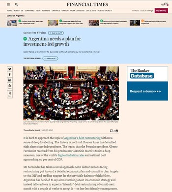 “La mayoría de las naciones deudoras que se enfrentan a la reestructuración presentan un plan económico detallado y se comprometen a establecer objetivos claros para conseguir el apoyo del FMI y de los acreedores para las inevitables quitas a las tenencias de los acreedores que se producirán a continuación”, dice el texto firmado por el consejo editorial del Financial Times. “La Argentina ha decidido no decir casi nada sobre su estrategia económica”, agrega.