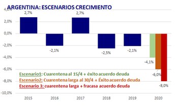 - Se pueden hacer algunos escenarios según lo que tarde la cuarentena, su prórroga y cuánto demore la población en recuperarse de la enfermedad y varios casos de solución de los temas de la deuda pública. Para este año ya teníamos una caída de 1,4% en el PBI del país del 2020 versus 2019, que ahora en el mejor de los casos seria de una baja en el rango de 4% hasta 8% en el peor de las situaciones. Esto va a depender de las decisiones políticas, de cuantas empresas tengan que cerrar y les sea más difícil la recuperación posterior y del tamaño del problema que queramos seguir sosteniendo con cuarentena total o parcial.