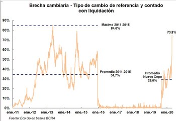 La brecha cambiaria entre el “liqui” y el oficial mayorista es la más alta desde febrero de 2015, cuando regía el anterior “cepo” de la administración de Cristina Kirchner, ahora en el 65,3%, después de haber tocado el 74% en horas del mediodía.