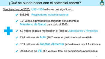 Allí, por caso se asegura que con los USD 4.500 millones que el gobierno “ahorraría” –dejaría de pagar, en rigor–, sólo este año se podría comprar una de estas seis opciones: