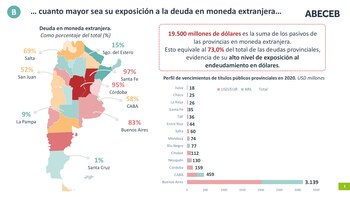 Un trabajo de la consultora Abeceb señala que 14 de las 24 distritos del país tienen deuda denominada en moneda extranjera. Según los números de la consultora que fundó el ex ministro de Producción Dante Sica, las provincias acumulan pasivos por 19.500 millones de dólares, lo que equivale al 73% del total de las deudas provinciales, evidencia de su alto nivel de exposición al endeudamiento en dólares.