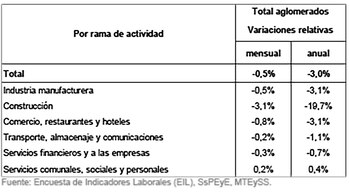 Y si bien en todos los tamaños de empresas se observaron ajustes a la baja en las dotaciones, fue en las de entre 10 y 49 ocupados y en las de entre 50 y 199 puestos en relación de dependencia en donde se registraron las caídas más pronunciadas, 0,6% y 0,7% respectivamente.