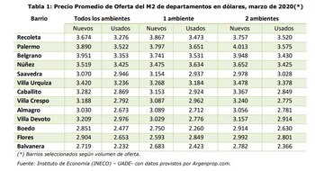Para comprar un metro cuadrado de una vivienda en la ciudad de Buenos Aires se necesitan —en promedio— 5,53 salarios para una propiedad nueva y 4,99 para una propiedad usada. El cálculo fue realizado por el Instituto de Economía de la UADE, que presentó los datos del Informe del Mercado Inmobiliario correspondiente a marzo de 2020.