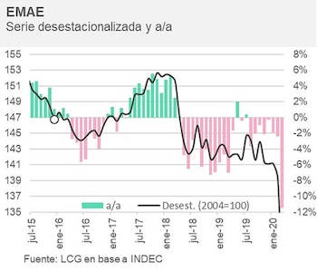 El Estimador Mensual de la Actividad Económica (EMAE) se derrumbó un 11,5% interanual en marzo, afectado por la recesión y el inicio de la cuarentena obligatoria por la pandemia de coronavirus.