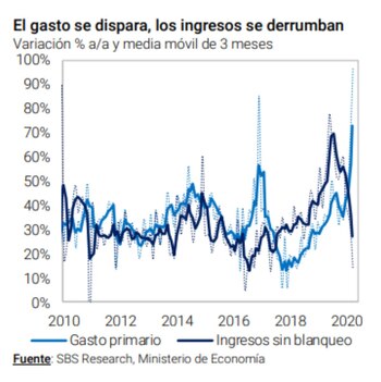 En ese sentido, un informe del Grupo SBS apuntó: “Abril mostró un claro deterioro de las cuentas públicas pero no se desvió demasiado de nuestro escenario base, por lo que seguimos esperando un déficit primario de 5,5% del PBI en el año. A pesar de que buena parte del deterioro se sustenta en efectos transitorios, destacamos que la ausencia de financiamiento de mercado implica que este importante déficit presupuestario deberá ser financiado casi exclusivamente por el BCRA”.