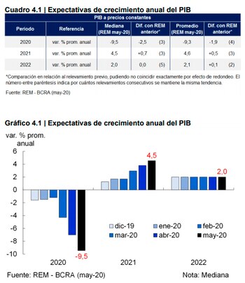 El dato más negativo del REM de mayo, en el que 40 consultores y bancos brindaron sus pronósticos entre el 26 y el 29 de ese mes, es que los analistas esperan una recesión cada vez más profunda de la economía como producto de las medidas de aislamiento para enfrentar la pandemia del Covid-19. Proyectan una brusca variación real negativa del Producto Interno Bruto (PIB) para 2020 de 9,5%, lo que implica una caída de 2,5 p.p. respecto al pronóstico relevado en la encuesta del mes previo.