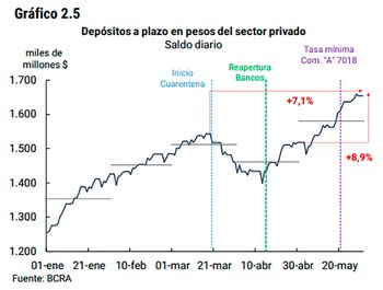 Los plazos fijos del sector privado crecieron durante mayo un 8,1% en valores nominales, lo que implica una suba del 5,4 en términos reales (descontada la inflación), según datos del Informe Monetario Mensual del BCRA. Al término de mayo, apuntó el informe, el saldo de las colocaciones a plazo se ubicó 7,1% por encima de los niveles observados antes del “Aislamiento social, preventivo y obligatorio”.