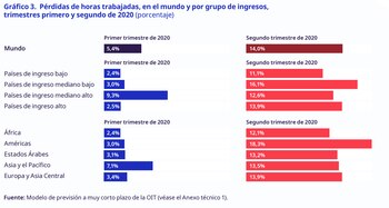 “En el primer trimestre del año se perdió aproximadamente un 5,4% de las horas de trabajo en todo el mundo (equiparable a 155 millones de empleos a tiempo completo), con respecto al cuarto trimestre de 2019. Se prevé que en el segundo trimestre de 2020 se pierda en todo el mundo el 14% de las horas de trabajo (equiparable a 400 millones de empleos a tiempo completo), y que las mayores pérdidas se registren en las Américas, a razón del 18,3%”, agregó el informe.