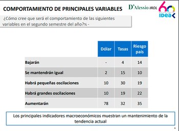 Un punto en donde el empresariado local volvió a mostrar un consenso cerrado es en lo referido al tipo de cambio. Cuando se les preguntó cómo creían que iban a comportarse las principales variables tomando como tales dólar, tasas y riesgo país, se observa una dispersión respecto de si subirán, se mantendrán o bajarán en los últimos dos tópicos. Sin embargo, a la hora de hablar del tipo de cambio los representantes de las compañías, sin importar su tamaño, volvieron a ver una devaluación en el futuro ya que el 78% contestó que espera una suba del dólar durante el segundo semestre.