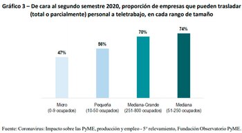 - “Además, entre 800.000 y 1 millón de trabajadores formales podrían estar involucrados en los procesos de implementación parcial del teletrabajo en el 51% de las firmas con hasta 800 ocupados”, apuntó el informe.
