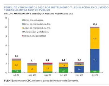 El Gobierno también incumplirá con el vencimiento del Discount 2033 en dólares con ley argentina (DICAD), aunque vale recordar que por el Decreto 346 del 5 de abril de este año, el gobierno de Alberto Fernández dispuso el diferimiento de pagos de intereses y amortizaciones de títulos en dólares emitidos bajo ley local hasta el 31 de diciembre de 2020 o bien hasta una fecha anterior que el Ministerio de Economía determine, “considerando grado de avance y ejecución del proceso de restauración de la sostenibilidad de la deuda”.