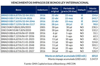 Por lo tanto, corrido el período de gracia de 30 días desde los vencimientos de cupones, en el mes de agosto se incorporarían al default otros USD 584 millones, de no mediar un acuerdo por la deuda.