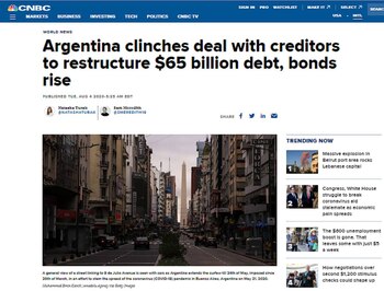 En tanto la cadena de noticias norteamericana CNBC expresó que Argentina acordó con sus acreedores después de que “la tercera economía más grande de América Latina, que estaba en default, había dejado impagos miles de millones de dólares en bonos, ya que su economía se ve afectada por la pandemia de coronavirus”.