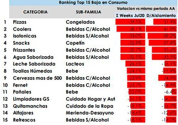 Durante la última semana de julio, todas las categorías de productos registraron una contracción, aunque la de bebidas es la que persiste con las mayores variaciones negativas. En el caso de los alimentos, la caída esa semana fue del 4,9% interanual; bebidas, del 15,1%; limpieza, del 6,8%; y cuidado personal, del 0,7%. En el caso de las bebidas, las sin alcohol registraron mayor caída que las alcohólicas (-16,9% versus -9,1%).