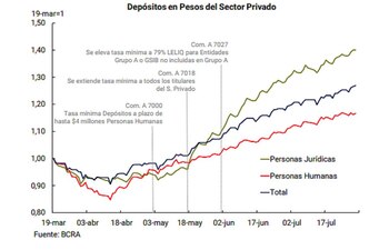 El último Informe Monetario Mensual del BCRA ponderó que “la evolución diaria de las colocaciones a plazo refleja el impacto positivo de la política de tasas mínimas de interés, que asegura una retribución positiva en términos reales para todos los depositantes del sector privado. Discriminando el saldo por tipo de titular, se verifica desde mediados de mayo un sostenido crecimiento tanto de las líneas de personas humanas como de personas jurídicas”.