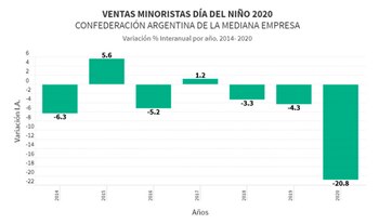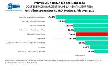 Las ventas por el Día del Niño en los negocios del sector de pequeñas y medianas empresas cayeron 20,8% respecto de la misma celebración en 2019, señaló la Confederación Argentina de la Mediana Empresa (CAME), que atribuyó la menor compra de unidades a la pérdida de ingresos familiares por la cuarentena y precisó que el ticket promedio de compra fue de $ 990.
