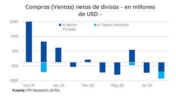 Al mismo tiempo que crece la emisión y, como consecuencia, la absorción monetaria, el BCRA enfrenta la pérdida de divisas, que en agosto alcanza los USD 1.000 millones, entre los USD 600 millones que acumula como saldo neto negativo por sus intervenciones cambiarias, más otros USD 376 millones entregados al Gobierno, principalmente para cumplir con obligaciones con organismos internacionales.