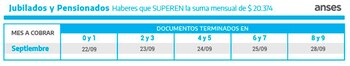 El calendario de pago para jubilados y pensionados se dividirá en dos. La primera tanda —los que perciben menos de $20.374— cobrarán desde el martes 8 hasta el lunes 21 de septiembre. A partir del martes 22 cobrará el resto de los beneficiarios.