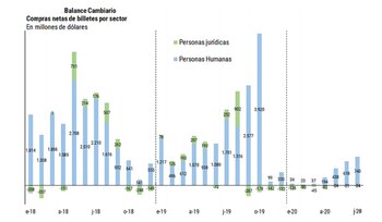 Asimismo, el resultado de billetes se explicó en julio por las compras netas de las “Personas humanas” por USD 740 millones y las ventas netas de empresas por USD 24 millones. En agosto las compras netas se aproximaron a los USD 1.000 millones, un máximo desde octubre del año pasado.
