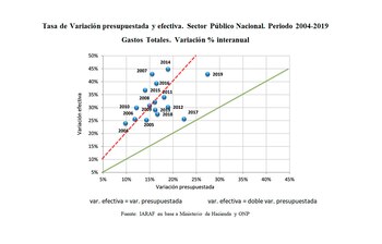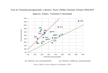 En los gráficos adjuntos puede apreciarse que en el caso del gasto todos los años la variación efectiva que tuvo fue superior a la proyectada. Todos los puntos están arriba de la línea de 45 grados. Si un año se encontrara sobre la línea de 45 grados significaría que ese año la variación efectiva coincidió con la variación proyectada. En el caso de los ingresos, excepto 2017, todos los años tienen una variación efectiva superior a la variación presupuestada.