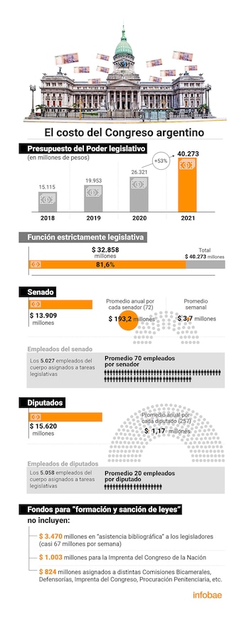 Esos recursos serán aún más abundantes el año próximo. Aunque en el Presupuesto 2021 el Gobierno proyecta una tasa de inflación del 29%, la “ley de leyes” aumenta en 53% los fondos para el Poder Legislativo, desde los $26.321 millones de “crédito vigente” en el “presupuesto abierto” del ministerio de Economía para 2020, a $40.273 millones el año próximo.