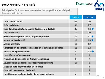 Secco hizo foco en los factores necesarios para poder aumentar la competitividad del país, y le llamó la atención que la búsqueda de consensos estuviera en el octavo lugar en el listado de los empresarios y en el séptimo la articulación público-privado, porque “estaría reflejando un alto grado de escepticismo sobre la posibilidad de convocatoria del Gobierno” para superar la crisis.