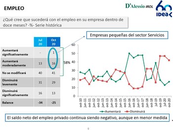 Y por tanto, pese al singular derrumbe del empleo, más en la franja informal que en la registrada en relación de dependencia, los empresarios de IDEA manifestaron que para los próximos meses apenas 1 de cada 6 prevé aumentar moderadamente la nómina, en contraste con una proporción cercana a 1 de cada 2 que estimó que continuará la baja de personal, principalmente asociada a retiros voluntarios y cese de la vida activa de quienes están próximos a la jubilación.