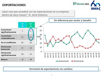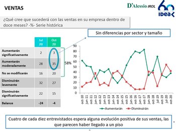 Y agregó el economista sobre el análisis del nuevo sondeo entre los socios de IDEA: “La inversión había llegado a 12,6% del PBI en el primer trimestre 2020 y en el segundo bajó a 9,5% del PBI, el menor nivel histórico, lo que demuestra que es uno de los temas de preocupación, porque sin inversión no se podrán crear empleos. Y el empresario que no ve condiciones para invertir, tampoco para crear empleos. Pero se sabe que el recurso humano es muy valorado, y por eso muchos buscan mantener la nómina”.