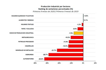 Las ramas insumos textiles (-1,2%) y la producción de papel y celulosa (-4,6%), muestran caídas acumuladas inferiores al promedio de la industria, mientras que las restantes ramas de actividad acumulan un retroceso superior al promedio, como la producción metalmecánica (10,3%), la refinación de petróleo (11,9%), el sector de tabaco (12,3%), los minerales no metálicos (21,7%), la siderurgia (28,7%) y la producción automotriz (32,2%).