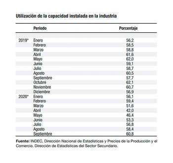 Por primera vez desde el inicio de la pandemia, la medición del uso de la capacidad instalada de la industria superó a la del mismo mes del año anterior, al mismo tiempo que sobrepasó el nivel previo a las restricciones provocadas por el Covid-19. En promedio, la capacidad utilizada de la industria alcanzó en septiembre al 60,8%, por encima del 57,7% del mismo mes de 2019 y también del 59,4% de febrero, último mes no afectado por el coronavirus ya que las restricciones comenzaron el 19 de marzo.