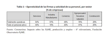 La rehabilitación para muchas actividades económicas no implica que los trabajadores de sus empresas hayan podido regresar a sus actividades previas a la aparición de la pandemia. En ese escenario, se estima que aproximadamente 2 millones de trabajadores de pequeñas y medianas empresas de todo el país aún se mantienen inactivos, según un informe de la Fundación Observatorio Pyme (FOP) realizado entre 1.400 compañías argentinas de menos de 800 empleados de diversas actividades.