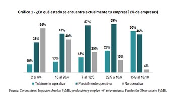 El estudio constató que solamente el 50% de las pymes analizadas se encuentran operando en forma total. A la vez, un 4% de las empresas se encuentra en estado no operativo y 46% funciona parcialmente. Sin embargo, sólo el 30% de las empresas informan tener activa a toda su planta de personal. “De este evidente descalce entre estado de operatividad de la firma y tasa de actividad de su personal, se deduce que un 20% de las empresas de este segmento empresarial está operando sin limitaciones, pero con menos personal activo que en la situación prepandemia”, señala el estudio.