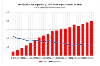 La creciente participación de China en el comercio mundial y el avance de su ingreso per cápita dieron por resultado, sobre todo a partir del 2005, una nueva demanda desde ese país dirigida a Brasil y la Argentina para el abastecimiento de productos básicos y alimentos. Las nuevas vinculaciones promocionaron cierta reciprocidad comercial con un aumento de las importaciones de productos industriales de tecnología alta y media (a diferencia de la oferta china de baja tecnología en bienes de consumo de la década del 90). Al inicio, los Estados Unidos fueron el mayor oferente desplazado de Brasil. Alemania y la Argentina siguieron en orden en ese desalojo. En el gráfico se puede ver la disminución de la participación de Argentina y el avance de China en las importaciones de Brasil.