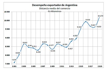 Fuente: FIEL en base a datos Indec. Corresponde al promedio de la distancia (en km) entre las capitales de los países socios, ponderado por el valor de las exportaciones (en miles de USD)