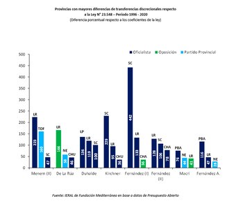En el también breve período de Duhalde, nota el estudio, que debió incluir algunos valores de 2003 correspondientes al período de Néstor Kirchner, las 3 provincias con más transferencias discrecionales fueron oficialistas: La Pampa, La Rioja y Santa Cruz, con 136,4%, 119,4% y 100,3% de diferencia respecto de sus cuotas en la Ley 23.548.