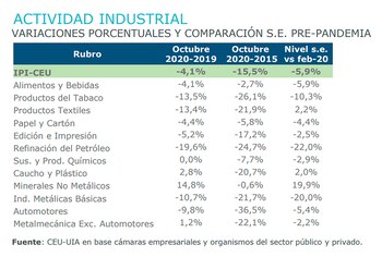 Cabe recordar que en septiembre la industria había alcanzado su primer resultado positivo del año, con una mejora del 2,6% respecto de agosto. Ese resultado no se pudo repetir en octubre, debido a que el sector automotriz tuvo una contracción del 9,8% (contra una suba del 16,1% del mes previo), afectado por la parada de actividad en una terminal.