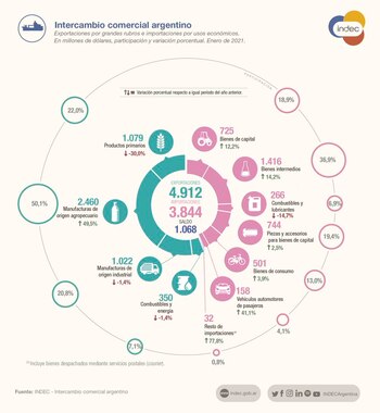 Según el informe oficial sobre Intercambio Comercial Argentino (ICA), en el primer mes del año, las exportaciones sumaron USD 4.912 millones, con un alza interanual del 7,3%, y las importaciones alcanzaron los USD 3.844 millones, lo que representó una mejora del 8,7 por ciento.
